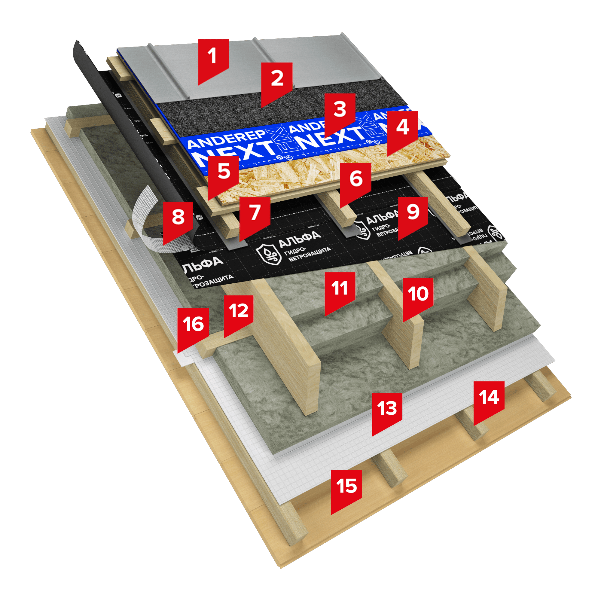 Под металлическую кровлю на сплошной настил укладывается подкладочный ковер марки ANDEREP NEXT SELF, который выполняет функцию дополнительной гидроизоляции. В качестве дощатого настила под многослойную черепицу может использоваться ориентировано-стружечная плита (ОСП-3); фанера повышенной влагостойкости (ФСФ) и шпунтованная или обрезная доска с относительной влажностью не более 20 %, толщиной 20-25 мм. Между досками сплошного настила каждые полметра необходимо организовывать зазор в 5 см для перетока воздуха в межстропильном пространстве. Для создания вентзазоров могут использоваться деревянный брус (толщиной 40-70 мм) или бруски XPS ТЕХНОНИКОЛЬ CARBON ECO. Теплоизоляция в системе - легкие негорючие плиты из каменной ваты ТЕХНОЛАЙТ ЭКСТРА. Пленка ТЕХНОНИКОЛЬ АЛЬФА ТОП, расположенная над утеплителем, защищает его от проникновения влаги, выдувания тепла и фракций утеплителя ветром. Слой пароизоляции - пленка ТЕХНОНИКОЛЬ МАСТЕР БАРЬЕР, монтируемая со стороны теплого помещения, предотвращает диффузию пара в толщу ограждающих конструкций и защищает утеплитель от увлажнения.