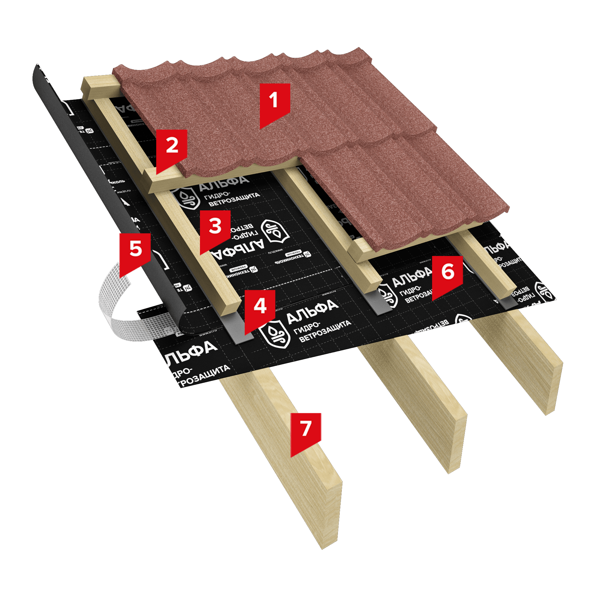 В качестве контробрешетки используется деревянный брусок 50*50. Под композитную черепицу необходимо устраивать пленку ТЕХНОНИКОЛЬ АЛЬФА ТОП для предотвращения задувания снега в подкровельное пространство и защиты от влаги. Данный вид конструкции допускает последующее утепление без демонтажа конструкции.