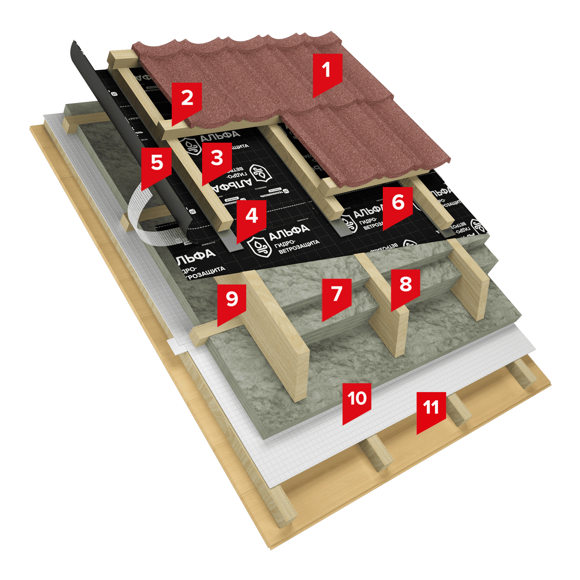 Система мансарда по деревянной стропильной системе с высококачественным покрытием из композитной черепицы ТЕХНОНИКОЛЬ LUXARD. Основание под композитную черепицу – обрешетка из бруса 50*50 мм с шагом 367 мм под оба типа панелей LUXARD. В качестве утеплителя в системе используются легкие негорючие плиты из стекловолокна ТЕХНОНИКОЛЬ Скатная крыша или из каменной ваты РОКЛАЙТ. Пленка ТЕХНОНИКОЛЬ АЛЬФА ТОП, расположенная над утеплителем, защищает его от проникновения влаги, выдувания тепла и фракций утеплителя ветром, повышает энергоэффективность конструкции. Для создания вентзазоров используется деревянный брусок 50*50. Слой пароизоляции - Пленка ТехноНИКОЛЬ МАСТЕР БАРЬЕР 4.0, монтируемый со стороны теплого помещения, предотвращает диффузию пара в толщу ограждающих конструкций и защищает утеплитель от увлажнения.