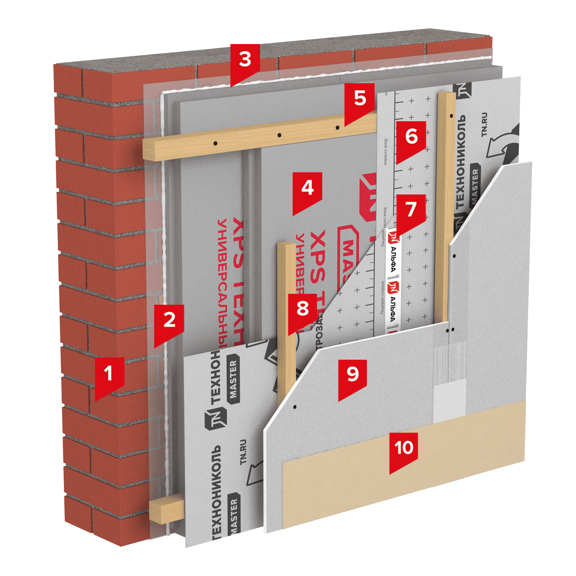 При устройстве данной системы теплоизоляционные плиты ТЕХНОПЛЕКС фиксируются к стене с помощью деревянных планок, пространство между которыми также заполняется экструзионным пенополистиролом. Затем фиксируется Пленка пароизоляционная ТЕХНОНИКОЛЬ АЛЬФА Барьер 4.0 с проклейкой нахлестов Лентой соединительной бутил-каучуковой ТЕХНОНИКОЛЬ. Пленка дополнительно прижимается контррейками, по которым выполняется внутренняя отделка помещения. Образовавшийся зазор между пароизоляцией и внутренней отделкой может использоваться для прокладки коммуникаций (электрика, отопление, водоснабжение) без нарушения пароизоляции.