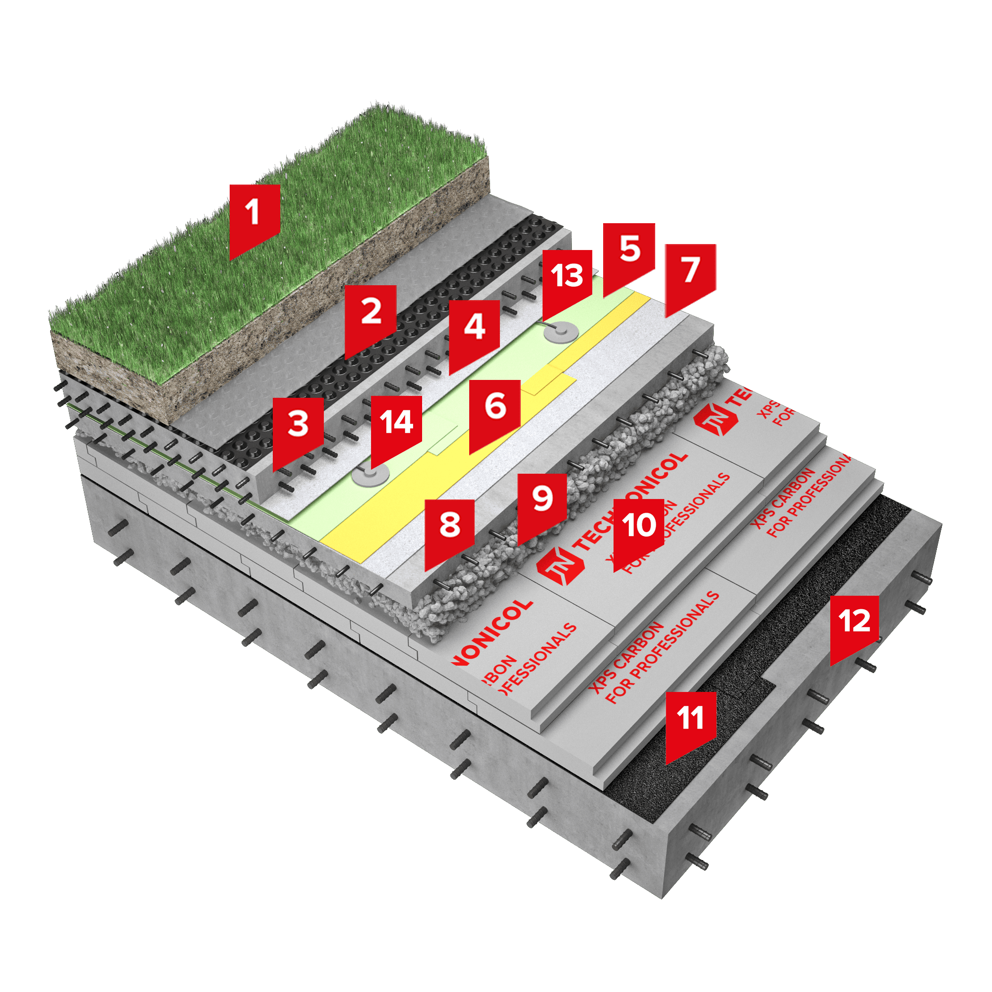 В системе ТН-СТИЛОБАТ КЛАССИК ГРИН поверх несущего железобетонного основания формируется слой пароизоляции для этого применяется наплавляемый материал Технобарьер. Он надежно защищает кровельный пирог от насыщения паром. Далее для устройства теплоизоляционного слоя применяется материал ТЕХНОНИКОЛЬ CARBON PROF отличающийся высокими теплоизолирующими характеристиками и повышенной прочностью на сжатие. Уклонообразующий слой формируется из керамзитобетона или плит экструзионного пенополистирола ТЕХНОНИКОЛЬ CARBON PROF SLOPE. Далее укладывается выравнивающая цементно-песчаная стяжка с армированием. В качестве подстилающего слоя применяется Геотекстиль иглопробивной термофиксированный ТЕХНОНИКОЛЬ ПРОФ 300. Поверх подстилающего слоя монтируется нижний гидроизоляционный слой из корнестойкой полимерной мембраны LOGICBASE V-SL , поверх которой монтируется верхний слой гидроизоляции из полимерной мембраны с фактурной поверхностью LOGICBASE V-ST, который позволяет создать герметичные карты площадью не более 150 м2. Проверка целостности всей гидроизоляции на этапе строительства либо эксплуатации производится методом вакуумного теста. Скрепление полотен гидроизоляционной мембраны осуществляется путем сварки нахлестов горячим воздухом при помощи автоматического сварочного оборудования с образованием двойного шва и центрального воздушного канала, который позволяет контролировать герметичность швов. В каждый герметичный контур и секцию устанавливаются ПВХ контрольно-инъекционные штуцеры и инъекционные трубки в количестве 5 шт., которые позволяют контролировать состояние гидроизоляции.  При необходимости ремонт системы можно выполнить путём инъектирования ремонтных составов LOGICBASE INJECT на этапе строительства и/или эксплуатации здания.