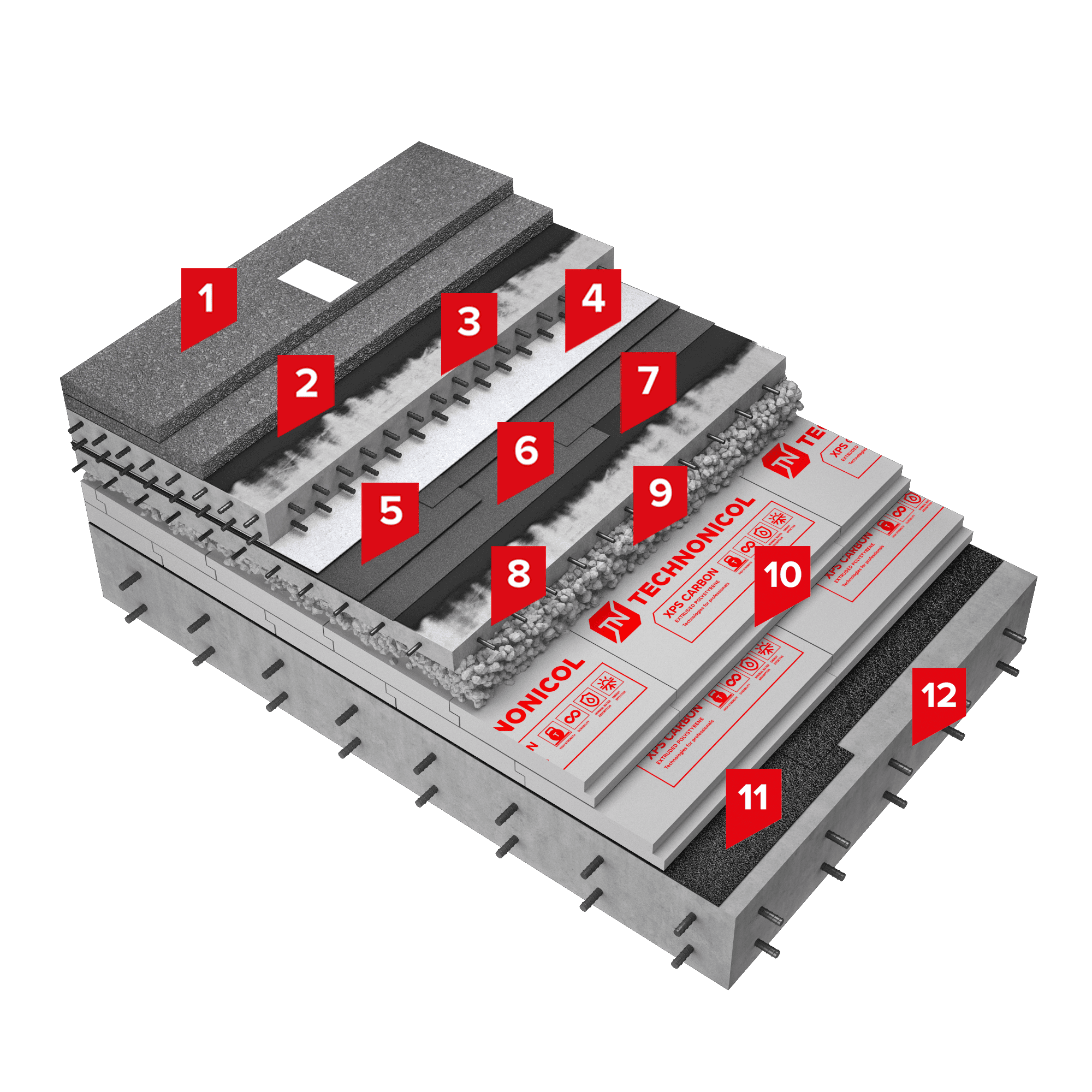 Для устройства теплоизоляционного слоя применяется материал XPS ТЕХНОНИКОЛЬ CARBON SOLID 500 отличающийся высокими теплоизолирующими характеристиками и повышенной прочностью на сжатие (прочность на сжатие не менее 500 кПа).