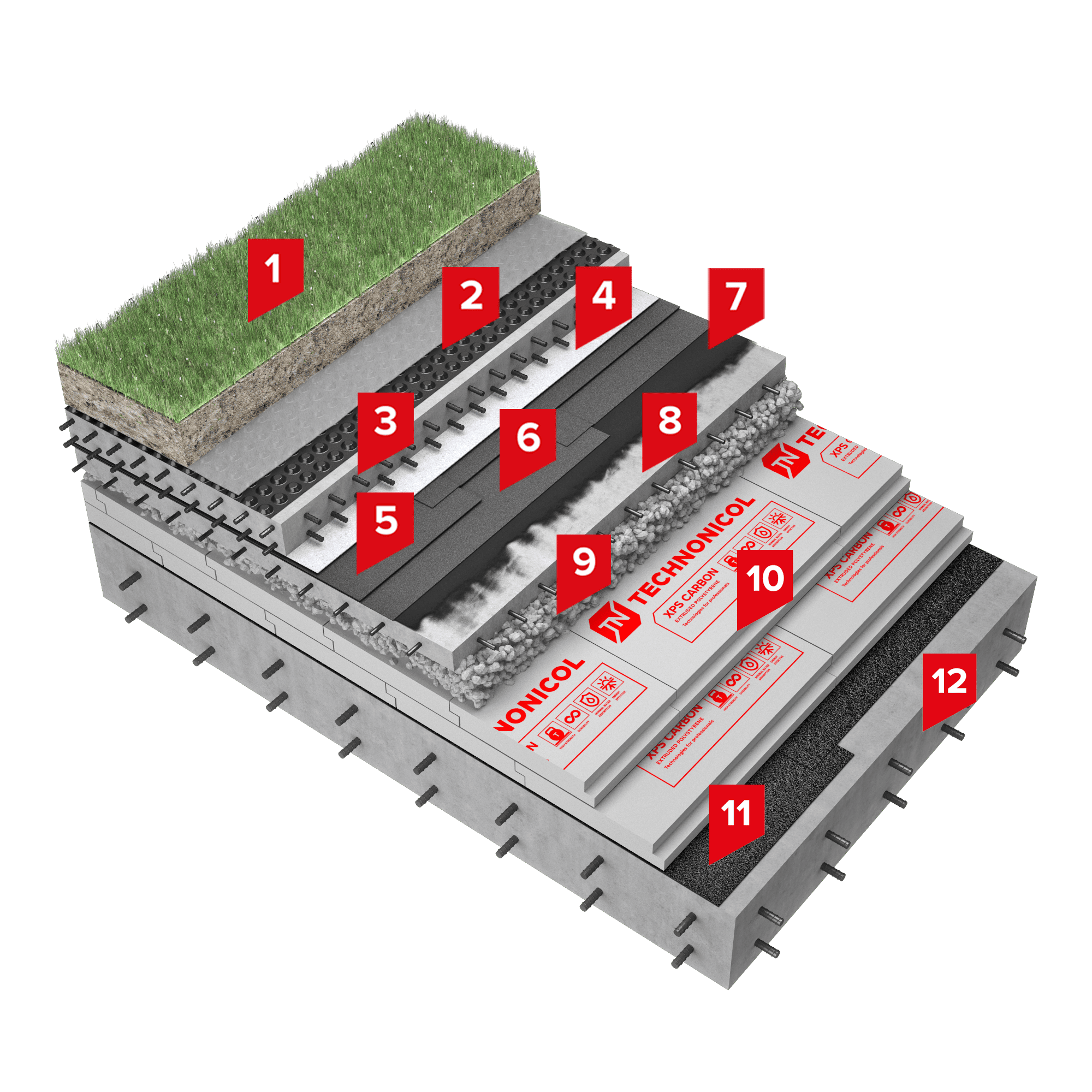 В системе применяется двухслойный водоизоляционный ковер из наплавляемых битумно-полимерных материалов Техноэласт ФУНДАМЕНТ в качестве нижнего слоя и Техноэласт ГРИН в качестве верхнего. Материал Техноэласт ГРИН дополнительно выполняет функцию защиты водоизоляционного ковра от повреждения корнями растений. Применение корнестойких материалов в озелененных крышах указано в п. 5.5.2 СП 17.13330.2017.