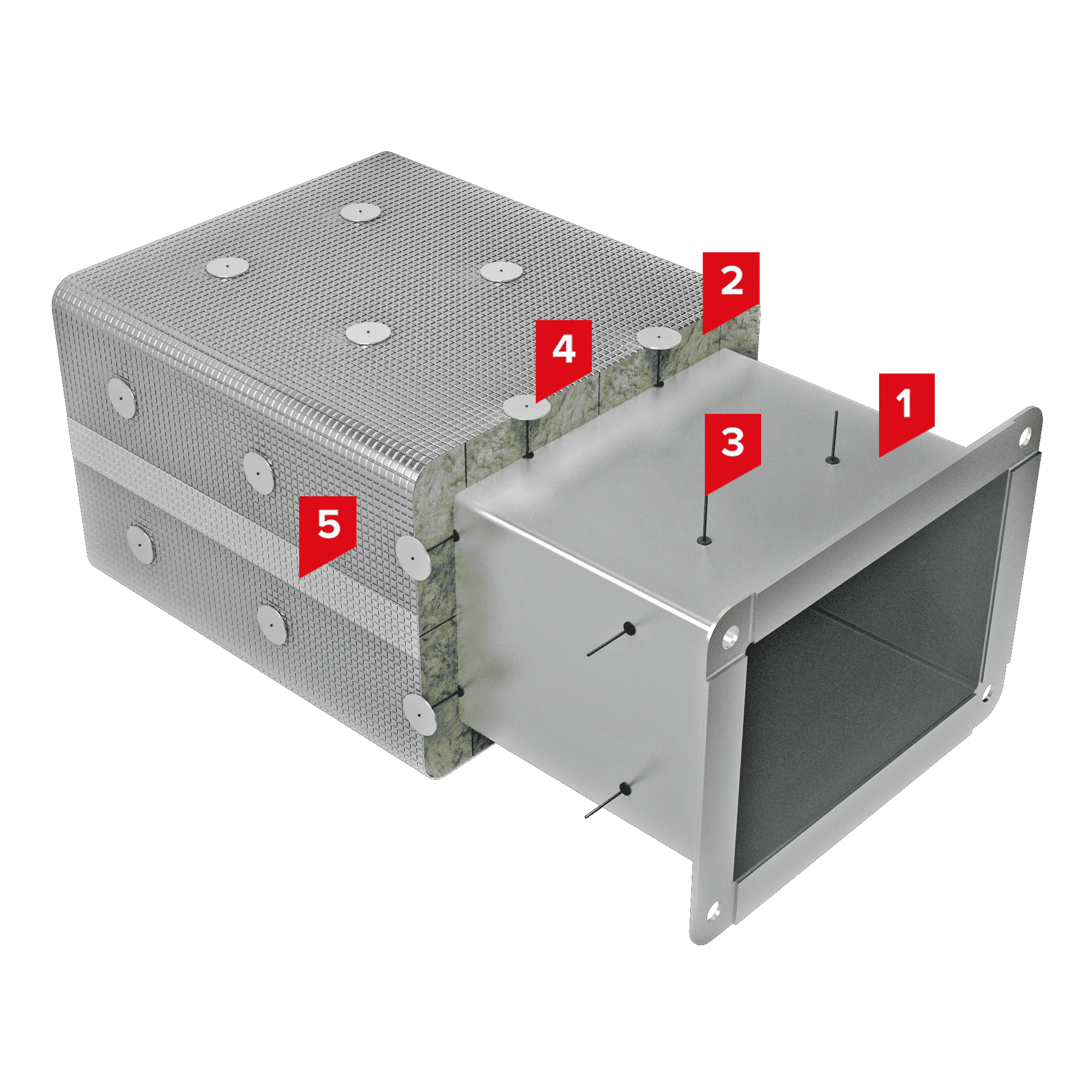 Крепление матов к корпусу воздуховода возможно на приварные штифты с прижимными шайбами или при помощи бандажей.