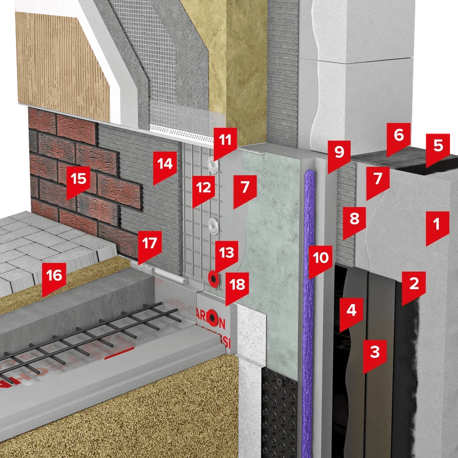 Система обладает высокими пожарно-техническими характеристиками за счет применения защитного слоя толщиной не менее 30 мм. В системе в качестве теплоизоляции экструзионный пенополистирол Сэндвич ТЕХНОНИКОЛЬ Ц-XPS, который покрыт защитным слоем из высокопрочного полимерцементного бетона толщиной 10 мм. Основанием системы могут быть несущие, самонесущие и навесные стены из монолитного железобетона, каменных и армокаменных кладок (плотностью не ниже 600 кг/м3).