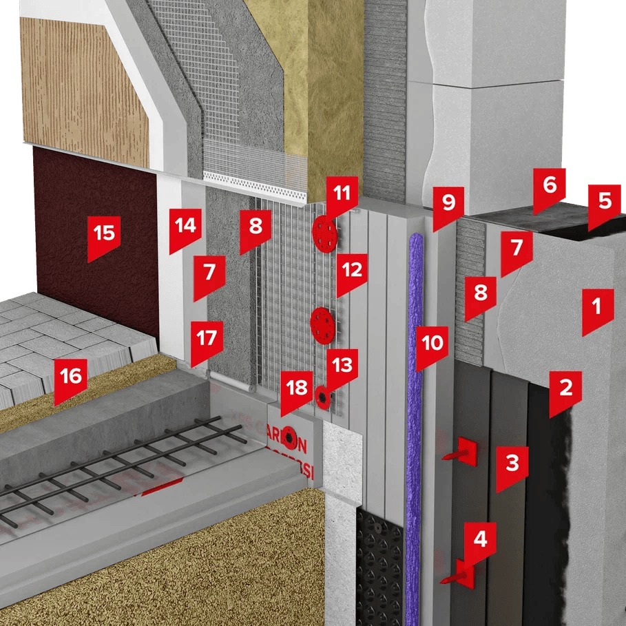 Система обладает высокими пожарно-техническими характеристиками за счет применения защитного слоя толщиной не менее 30 мм. В системе в качестве теплоизоляции применяется экструзионный пенополистирол ТЕХНОНИКОЛЬ CARBON ECO FAS, который имеет фрезерованную поверхность для повышения адгезии с клеевыми составами, а также обладает низким водопоглощением и низкой теплопроводностью.
