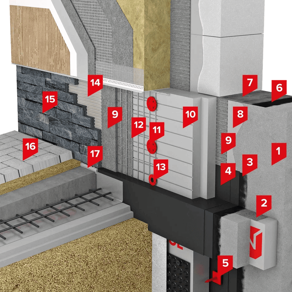 Система обладает высокими пожарно-техническими характеристиками за счет применения защитного слоя толщиной не менее 30 мм. В системе в качестве теплоизоляции применяется экструзионный пенополистирол ТЕХНОНИКОЛЬ CARBON ECO FAS, который имеет фрезерованную поверхность для повышения адгезии с клеевыми составами, а также обладает низким водопоглощением и низкой теплопроводностью.