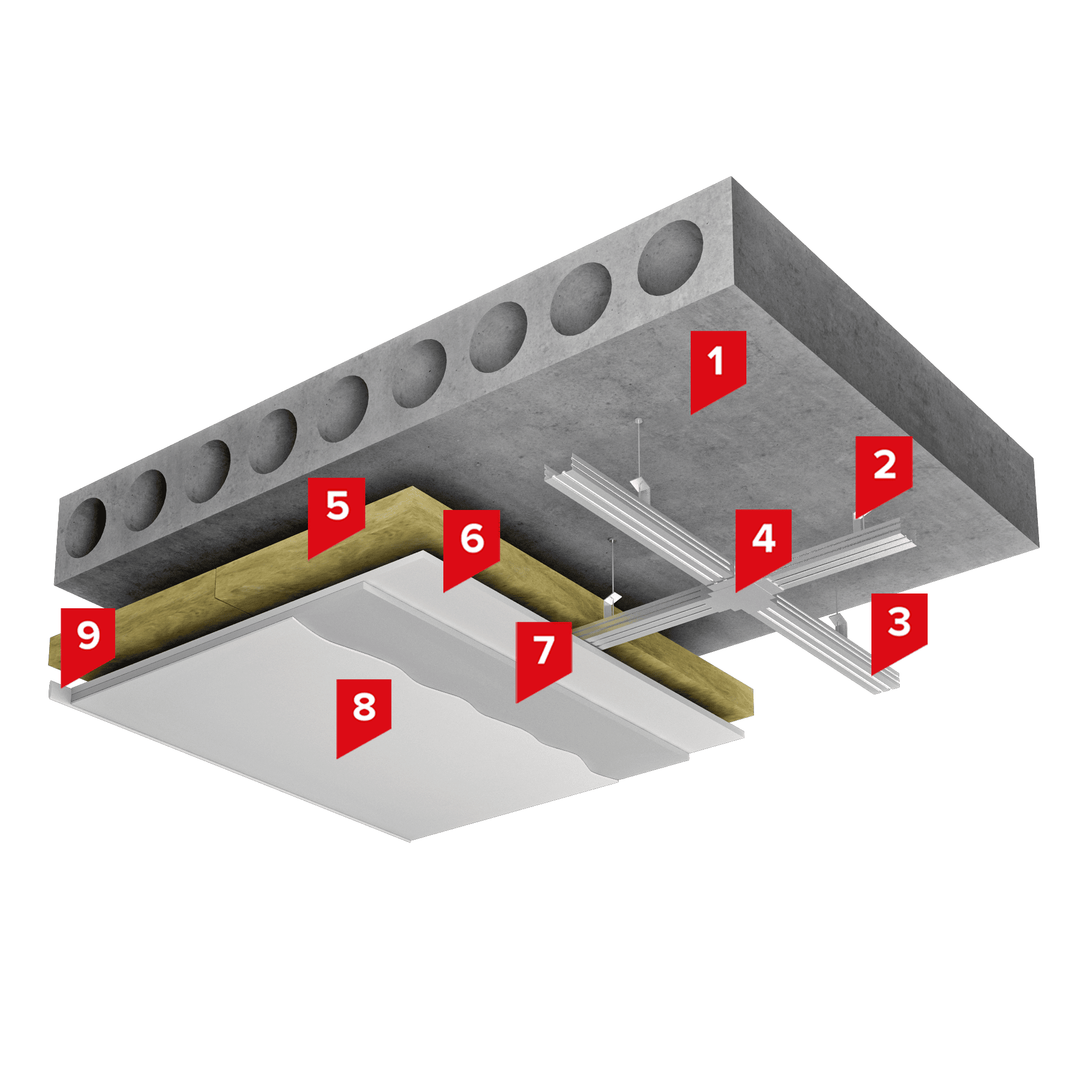 Система ТН-ПОТОЛОК Акустик Каркас представляет собой каркас из металлических профилей или деревянных брусков, который закреплен на относе от плиты перекрытия. Для крепления потолочных профилей к плите перекрытия используют подвесы или виброподвесы, которые также позволяют компенсировать неровности основания. На каркас уложены плиты из каменной ваты или стекловолокна, которые укладываются на несущий профиль сплошным слоем. Применение плит из каменной ваты или стекловолокна в системе и крепление каркаса на относе от плиты перекрытия обеспечивает акустический комфорт в помещении и позволяет скрыть коммуникации. В качестве облицовки используются ГКЛ, ГСП или ГВЛ листы.